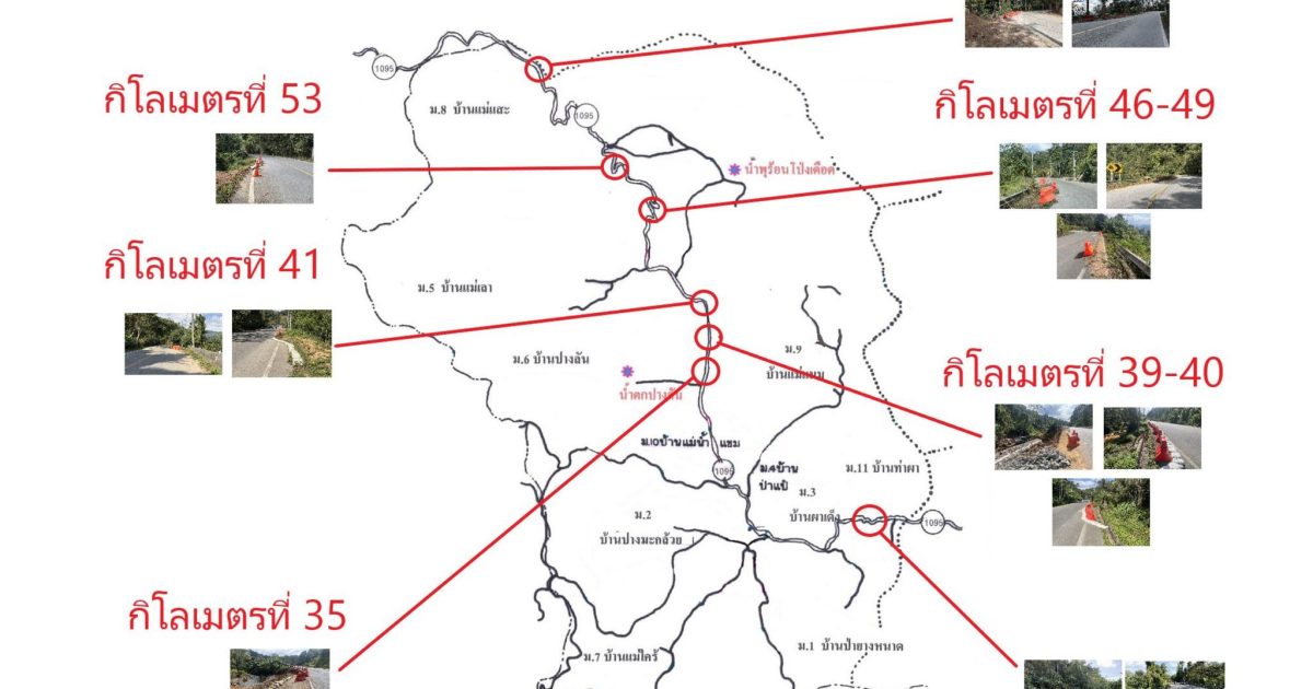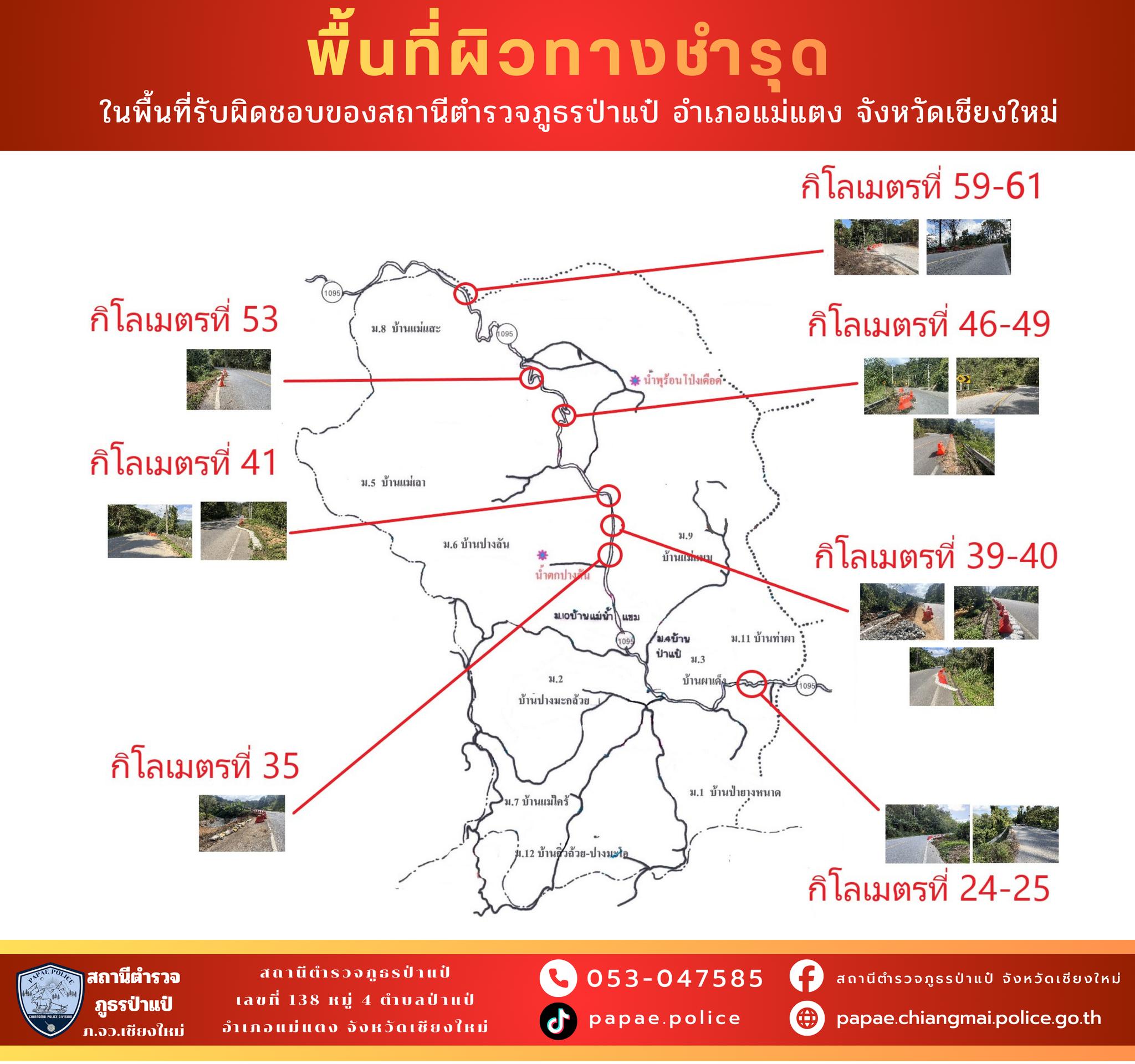ประชาสัมพันธ์ผู้ใช้เส้นทาง เชียงใหม่-ปาย ถนน ทล.1095 ในความรับผิดชอบของ สภ.ป่าแป๋ มีถนนชำรุดหลายจุด สภ.ป่าแป๋ได้ทำแผนภาพจำนวนจุดที่ชำรุดไว้แล้ว ในการเดินทางช่วงเทศกาลปีใหม่ให้ขับรถด้วยความระมัดระวัง