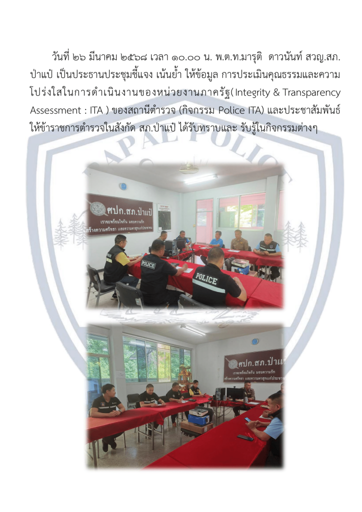• พ.ต.ท.มารุติ ดาวนันท์ สวญ.สภ.ป่าแป๋ เป็นประธานประชุมชี้แจง เน้นย้ำ ให้ข้อมูล การประเมินคุณธรรมและความโปร่งใสในการดําเนินงานของหน่วยงานภาครัฐ(Integrity & Transparency Assessment : ITA )