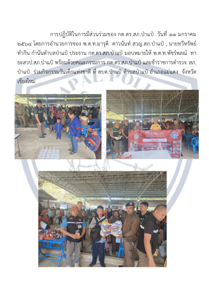 เจ้าหน้าที่ตำรวจ สภ.ป่าแป๋ ร่วมจัดกิจกรรมวันเด็ก 11 มกราคม 2568 โดย admin / ข่าวประชาสัมพันธ์,ข่าวกิจกรรม,ข่าวประชาสัมพันธ์,ข่าวกิจกรรม,มกราคม 2568 Facebook iconFacebookTwitter iconTwitterLINE iconLine