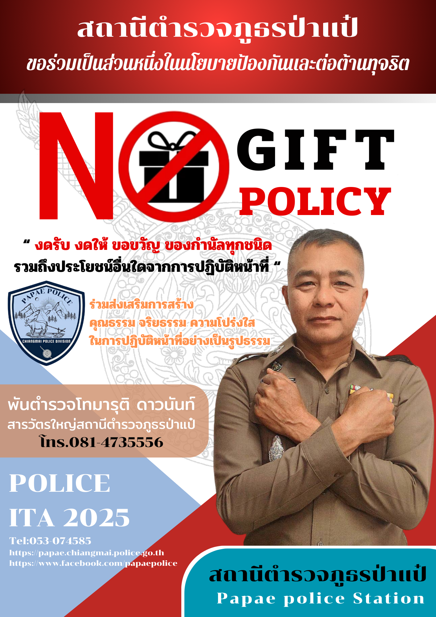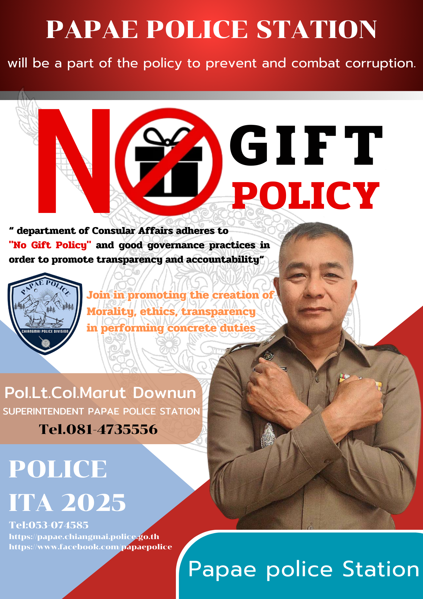 มีการเผยแพร่นโยบายต่อต้านการรับสินบน (Anti-Bribery Policy) โดย พ.ต.ท.มารุติ ดาวนันท์ สารวัตรใหญ่สถานีตำรวจภูธรป่าแป๋ ณ จุดประชาสัมพันธ์และจุดบริการ ให้เห็นอย่างชัดเจน